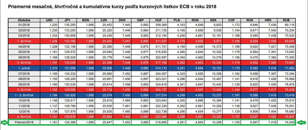 Po stiahnutí kurzového lístka si v spodnom riadku (zeleno označený riadok) nájdete priemerný ročný kurz, ktorý použijete na prepočet cudzej meny (príklad za rok 2018).